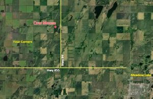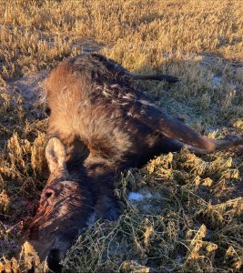 On December 8, 2023, between 5:30pm and 5:40pm, 3 rifle shots were heard near a farm residence along highway 4, west of Meadow Lake, SK. Legal hunting time had ended at 5:25pm, and there was no big game season open on this day. Shortly after the shots were heard, a vehicle was observed driving west bound on the Four Corners Grid, but no description could be obtained due to low light conditions. The next morning, a cow moose was located shot and left in an alfalfa field on the west side of the highway. Conservation Officers collected evidence at the scene.