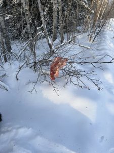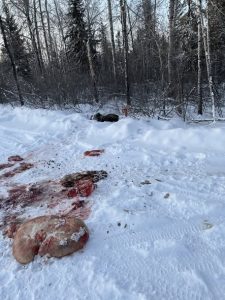 On January 4, 2025, Beauval Conservation Officers received a Turn in Poachers call reporting that a moose was killed the night prior along the Highway 155 Road Corridor Game Preserve, approximately 20km south of Beauval. Upon arrival at the location, officers were able to locate and follow a blood trail from where the moose appeared to have been killed. The blood trail led down Highway 155 to a logging road to where the suspects field dressed and skinned the moose. Officers discovered the gut pile, the moose hide and the back straps hung over a tree. There was no moose season on at the time, and hunting is prohibited in a road corridor game preserve by everyone.
