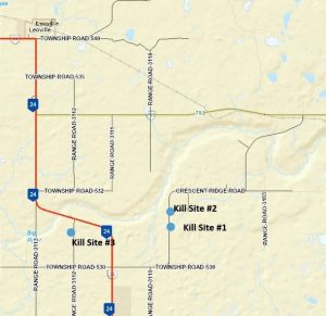 Spiritwood Conservation Officers received information on December 17, 2024, that a deer was shot at night near an occupied building southeast of Leoville, SK. Conservation officers attended to the area and located two kill sites on private land along Crescent Ridge Road. A third deer that was left to waste was also found south of Leoville, near the Big River Hill. Officers believe that all three violations are connected, and occurred between December 15 and 16, 2024.